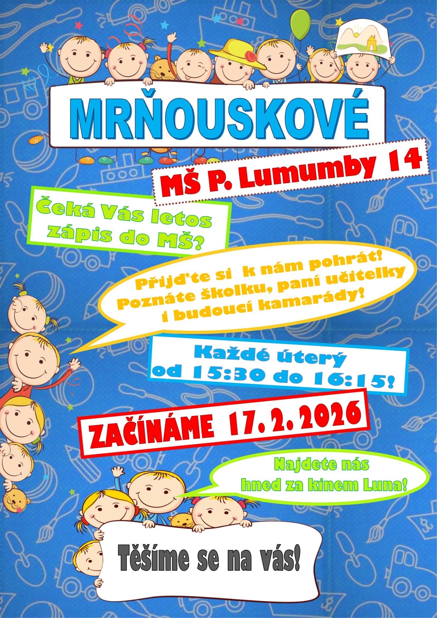 Srdečně Vás zveme každé úterý od 17. 2. 2026 (od 15:30 do 16: 15 hod.) do naší školky, kde budete mít možnost seznámit se s prostředím MŠ, ale také s paní učitelkami, které Vám rády zodpoví všechny dotazy ohledně zápisu, nástupu dítěte do MŠ a vše co Vás bude zajímat. Vaše děti si pohrají, poznají nové kamarády a pozvolna si zvyknout na nové prostředí.